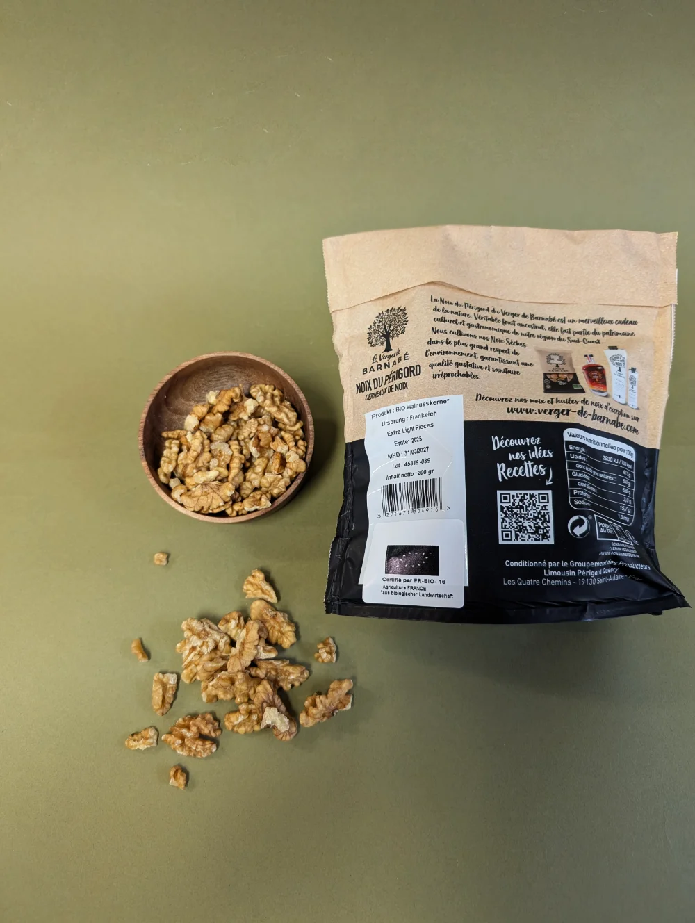 Unsere Bio Walnusskerne stammen aus Frankreich (Cerneaux, large, "Franquettes"), Region Perigord, werden dort vor Ort geknackt und sortiert, es werden ausschließlich Walnüsse von der Sortierung >30mm verwendet. Die Bio Walnusskerne sind ganz hell und schmecken herrlich, sie werden begeistert sein, zum knabbern, backen, Müsli oder belegen von Pralinen!