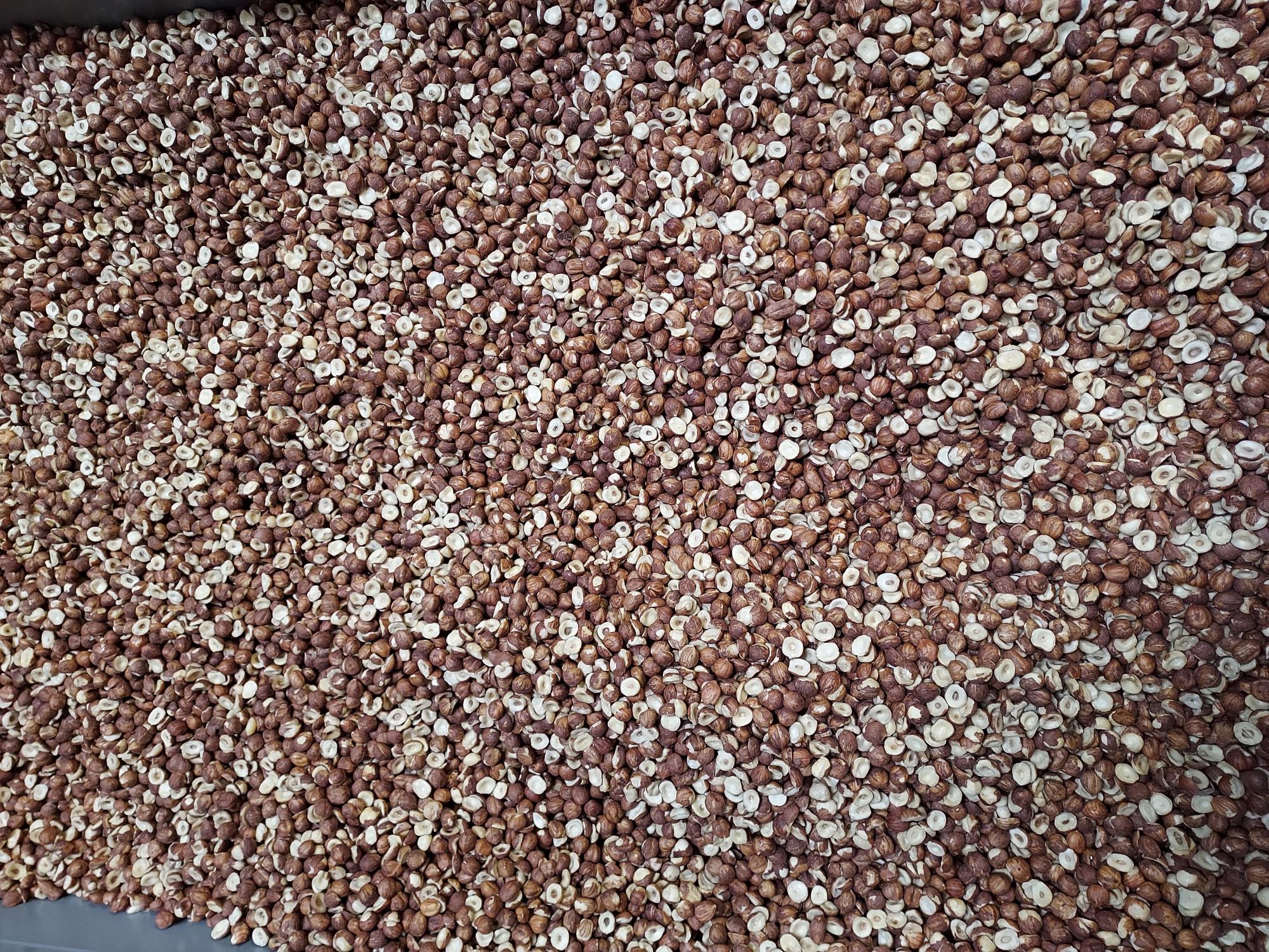 Der hohe Anteil an halben Kernen entsteht beim knacken kleiner Haselnüsse, diese sind schwieriger zu knacken. Durch wenig Luft zwischen Schale und Kern werden viele Kerne beim knacken halbiert. Im inneren der Haselnusskerne sind oft dunkle Verfärbungen zu sehen, diese sind sortenbedingt ganz normal.
