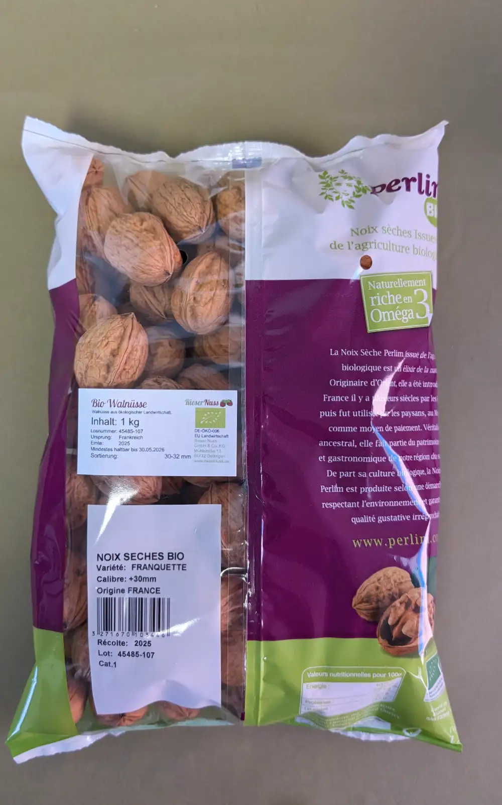 Bio Walnüsse in der Schale aus ökologischem Anbau aus Frankreich der Sorte Franquette aus der Region Perigord. Diese Walnüsse lassen sich leicht mit einem Nussknacker öffnen und schmecken hervorragend. Natürlich stammen diese aus der aktuellen Ernte 2025, Sortierung 30-32 mm, Originalverpackung 5 KG Zellulosesack, aufgrund der großen Sortierung empfehlen wir diese Walnüsse zum menschlichen Verzehr !