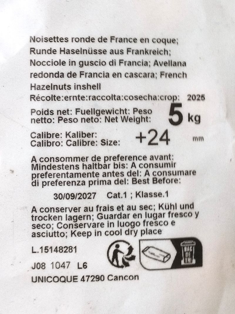 Hazelnuts in the shell from conventional cultivation from France, the hazelnuts taste excellent. Of course, these are from the new harvest 2020, grading 18-20 mm, original packaging 5 KG foil bag, failure rate approx. 2-4 %, due to the large grading we recommend these hazelnuts for human consumption! Best quality from France.